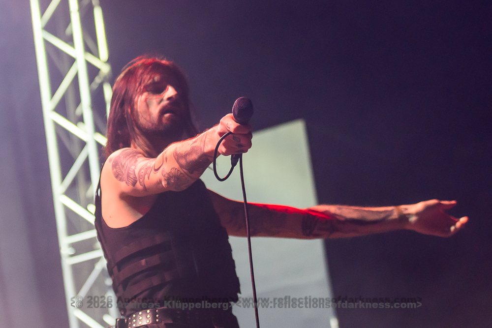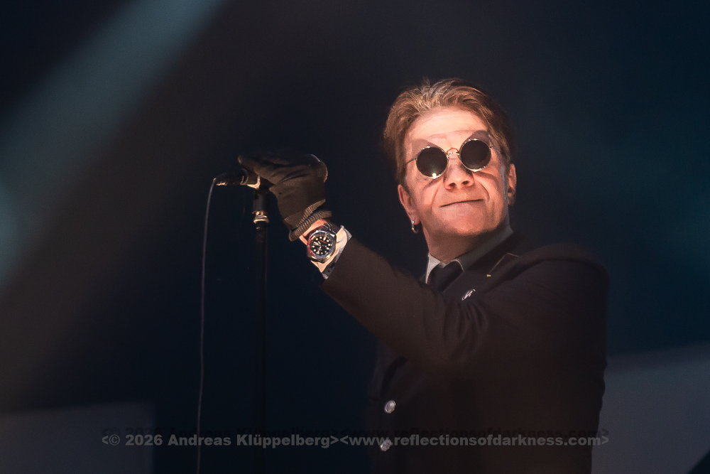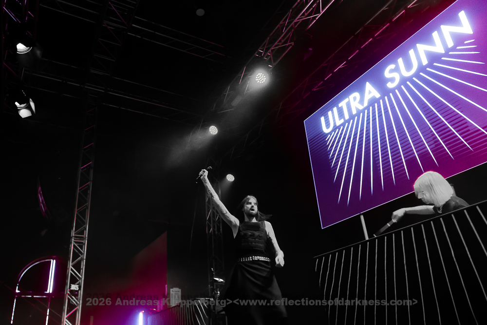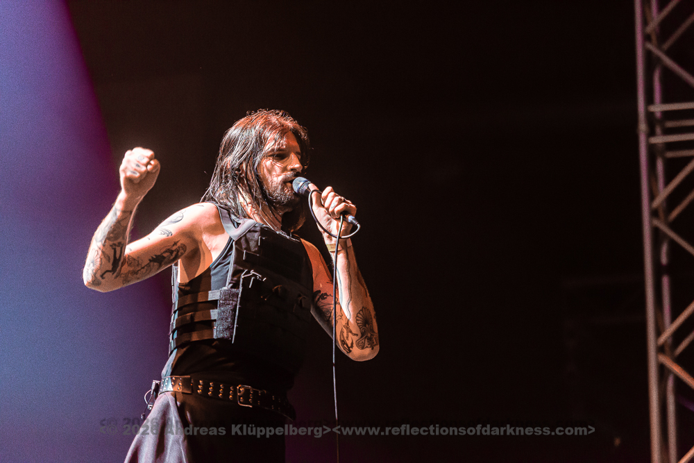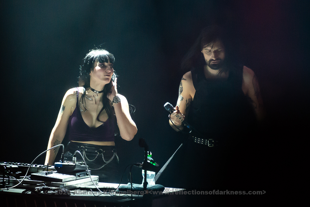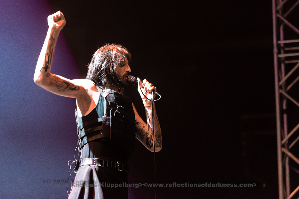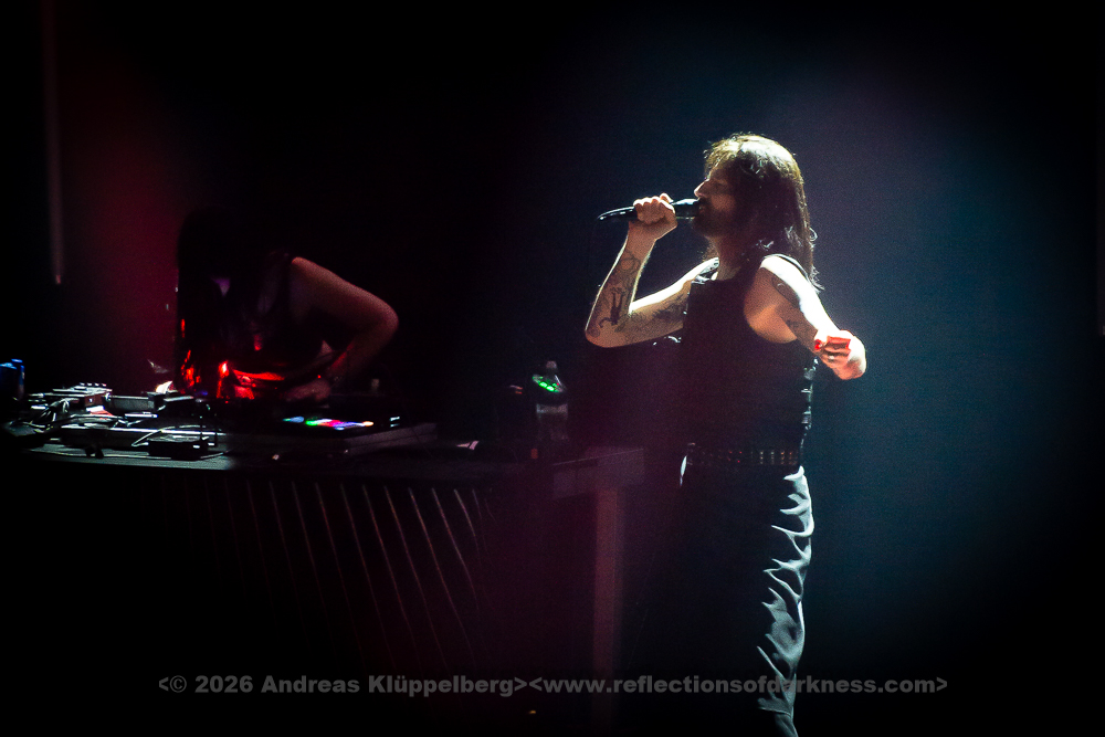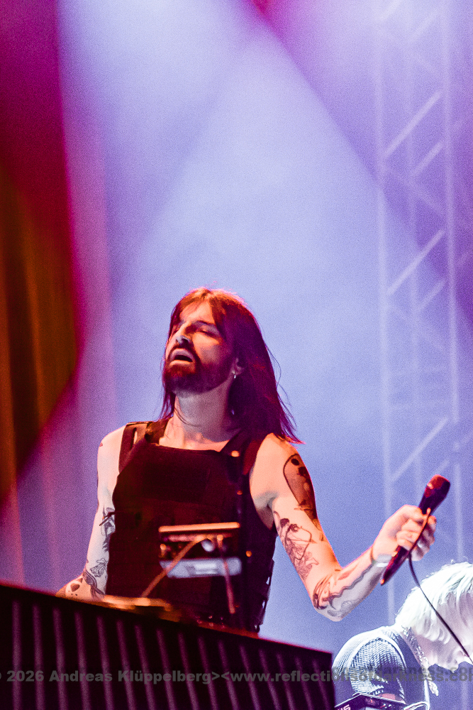 Although it is early in the afternoon, Turbinenhalle 1 is already very well filled. Even up on the balconies, many lovers of the darker musical realms have already gathered. And Oberhausen seems to be in great spirits and really up for it. Eli Van Vegas and Marcel Lüke are greeted with loud shrieks and energetic applause. “Hallo Oberhausen!” The intro opens the sonic space for ‘Der Wille zur Nacht’, and the audience is already singing and dancing exuberantly.
