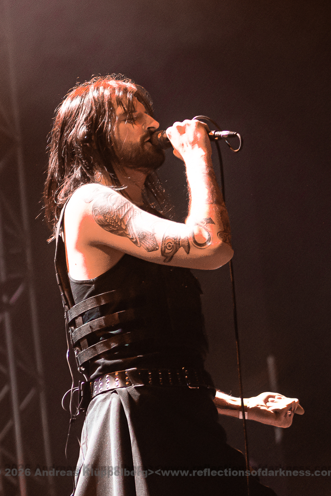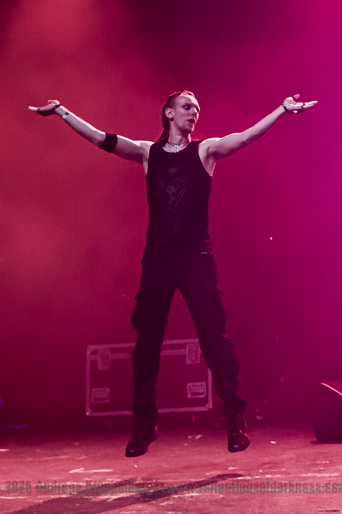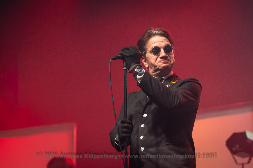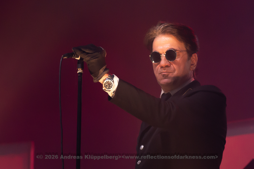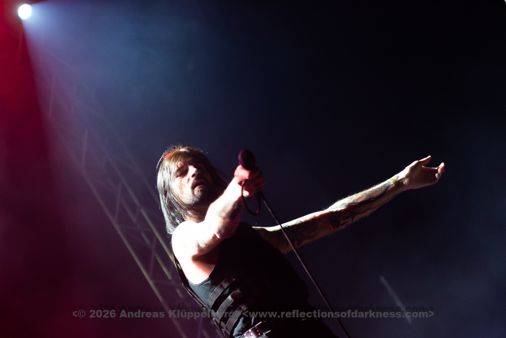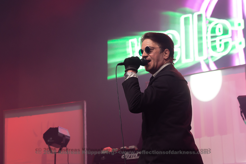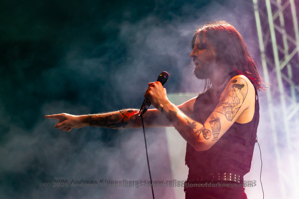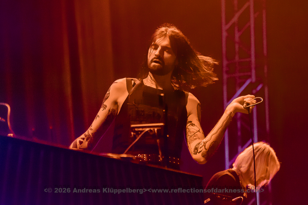 Although it is early in the afternoon, Turbinenhalle 1 is already very well filled. Even up on the balconies, many lovers of the darker musical realms have already gathered. And Oberhausen seems to be in great spirits and really up for it. Eli Van Vegas and Marcel Lüke are greeted with loud shrieks and energetic applause. “Hallo Oberhausen!” The intro opens the sonic space for ‘Der Wille zur Nacht’, and the audience is already singing and dancing exuberantly.