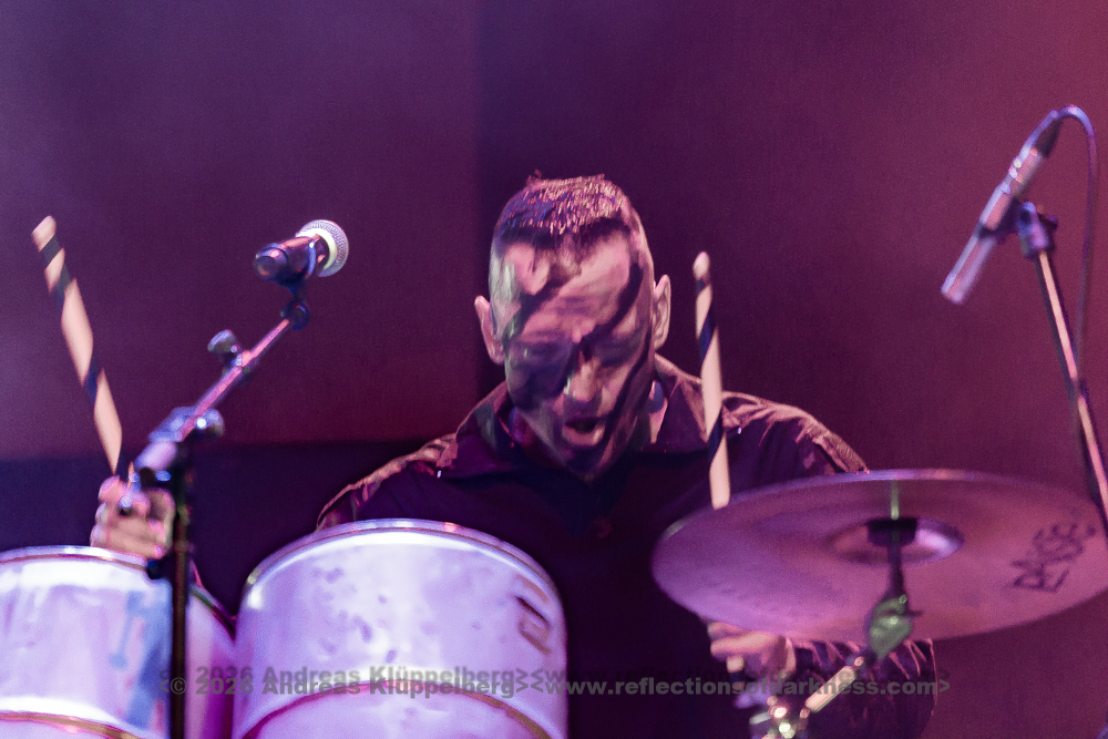 Hard, distorted beats, experimental sounds, and driving sequences accompany us for the next 50 minutes. The two men on percussion and controls give it their all. The audience dances itself into near ecstasy, and on the screen, we can watch ants and other creatures battling for survival in a struggle for the right of the strongest. The stage remains quite dark and is bathed in blue. Bright flashes flicker and pierce through the fog. The bass pounds relentlessly. This combination, along with the strong contrast between the bright screen and the dark stage, puts a real strain on my eyes and triggers my nervous system - I can feel a headache building behind my eyes.