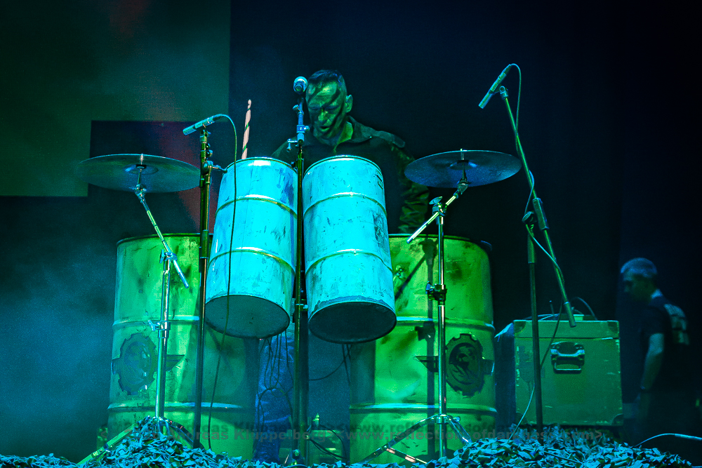 It is just after six. E-percussions and synthesisers have been set up and are flanked on both sides by large banners bearing the band’s logo. “Hello E-tropolis! Dance-ready? Dance!” The average age in the audience seems to have dropped. I am pleased to see many young people in the crowd. The invitation to dance is gladly accepted, and in return, the temperature in Turbinenhalle 2 quickly rises. The side project of X-FUSION mastermind Jan Loamfield really turns up the heat with a mix of Techno and Rhythm ‘n’ Noise, making the hall shake.