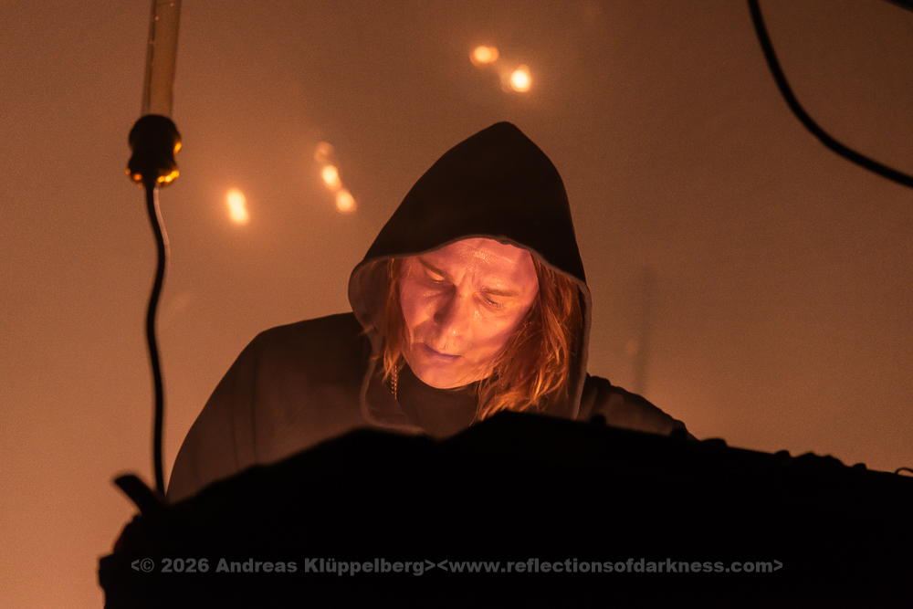 Twenty minutes to four, the intro begins, and the stage is filled with red light and flickering shadows. We have found a spot to the side. Unfortunately, the bass is booming here as well, and there is a slight lack of depth. The synthesisers almost resemble a wall behind which the person at the keys nearly disappears. Martin Sane is wrapped in a Frisian raincoat and pushes a spiked pram in front of him. The audience appears captivated and sways in time with the almost hypnotic soundscapes.