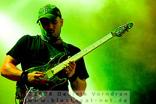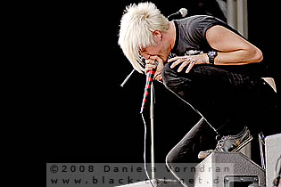 The kings of strange announcements were, without any doubt, THE BLACKOUT from South Wales; and the so far loudest act on the main stage. Dedicating all their songs to SLIPKNOT, they started off with the track ‘Hard Slammin’ and after the first minutes of that song, even the last sleepy spectator who had dared to come here was ruggedly torn out of their lethargy. Slicing punk riffs propelled by wild drumming and clean as well as screaming chant filled the air. But let’s come to the statements. Prior to ‘I know you are But What Am I’ he said that this one would be dedicated to all women he still wants to sleep with and later after a song, supposed to be a blend of MADONNA and PANTHERA (Did anyone actually notice that?) one of the singers demanded to send nude photos of men, women and animals (Sheep were mentioned) to their MySpace site. I couldn’t believe what I just heard from up there, very strange kind of humour, but if you leave that aside, then you can say they delivered one hell of a show and their microphone tricks strangely reminded me of yesterday’s performance of THE HIVES.