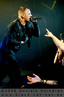With a little delay BIOMEKKANIK entered the stage as first band of the evening. Usually a solo project of Christer Hermodson, for live gigs it is extended to a full band presenting Mattias Johansson of PROJECT GRUDGE on guitar (http://www.myspace.com/projectgrudgemusic), Andreas Ingefjord aka Meistrich on keyboard (http://www.myspace.com/batallionhq) and Mattias Kristiansson hitting the drum pad on the eX stage. As learned later, it was the first time this constellation came together for a performance and I must say that it worked very well. There were some minor technical problems at the beginning because the band did not have any sound check, but also this was solved very fast, not only because of a good sound engineer. But now to the music! After the band entered the stage, Christer wearing a nice dark suit, the set started with the single ‘Enemy’, the only song that is released so far. Strange to see that people were not only singing the lyrics of this song, but also of several of the coming ones like ‘License to live’ or ‘State of Perfection’. Seems the fact that BIOMEKKANIK already gave out CDRs to friends made the music spreading out.