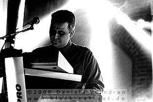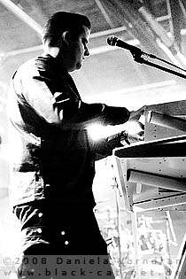 Lots of people were already waiting in front of the stage for the absolute newcomers and shooting stars of 2008: KLOQ - who’ve pulled with their debut ‘Move Forward’ an electronic firework- mainly consists of mastermind Oz Morsley, writing and producing the songs and additionally to live drummer Steve and bass player Tim, he took his position behind his synthesizer. They started the set with the sensational club hit ‘Ibiza’, a cover version of the dance act AMNESIA. For some minutes, this instrumental song filled the hall, before singer Greg Cumbers entered the stage and the next song ‘We’re just physical’ started. On the album version, no one less then Douglas McCarthy (NITZER EBB) delivered the vocals for this track, but also Greg’s shouts suited the song quite well. The explosive sound left you no choice but to dance and the audience in Berlin seemed to know the single from 2007 very well.