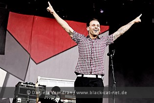 FRANK TURNER’s music hardly is that usual singer / songwriter stuff since it has a punk flavour to it and one crucial thing that like a spark was jumping from person to person in the big crowd in front of the stage. Hard to put it in words, but picture it like a kind of aura and happiness in his heart and face that is unbelievably strong. So he and his band got on stage and started with ‘Eulogy’ that first was played purely on acoustic guitar with Frank doing the powerful vocals, before the rest of the band joined in, adding a driving pace. First, the audience was still quite reserved. But with following tracks such as ‘Poetry of the Deed’ and ‘Reasons Not to Be an Idiot’ the distance was melting away and soon he had won them all over and he could ask every favour he wanted. For instance to ‘Sons Of Liberty’ he asked the crowd to help him doing a mutual guitar solo fuelled by the rage and anger inside them, or with ‘Photosynthesis’ everyone was supposed to sit down and sing.